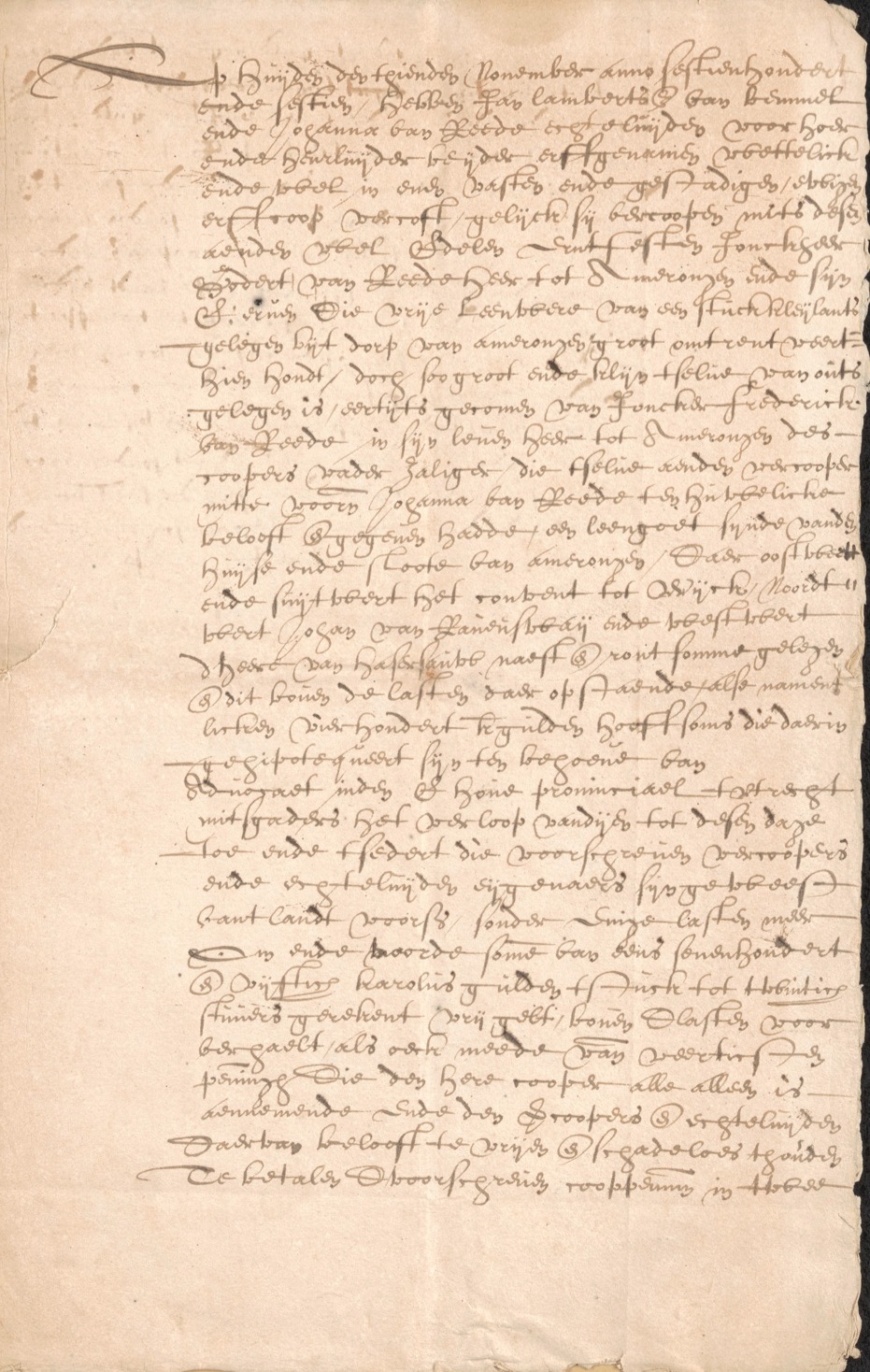 “Op húijden den thienden November anno sestienhondert ende sestien, hebben Jan Lambertss van Bemmel ende Johanna van Reede echtelúijden voor haer ende heurlúijden beijde erffgenamen wettelick ende wel, in enen vasten ende gestadigen, ewigen erffcoop vercoft, gelijck sij vercoopen mits desen aenden Wel Edelen Erntfesten Jonckheer Godert van Reede heer tot Amerongen ende sijn S: erven Die vrije Leenwere van een stúck kleijlants gelegen bijt dorp van Amerongen groot omtrent veerthien hondt, doch soo groot ende klijn t selúe van oúts gelegen is, eertijts gecomen van Joncker Frederick van Reede, in sijn leúen heer tot Amerongen des coopers vader zaliger, die tselúe aenden vercooper mitte voorn Johanna van Reede ten húwelicke belooft ende gegeven hadde, een leengoet sijnde vanden húijse ende sloote van Amerongen, Daer oostwert ende súijtwert het convent tot Wijck, Noordtwert Johan van Raúenswaij Ende Westwert d heere van Hasersaúw, naest ende ront somme gelegen ende boúen dit de lasten daer op staende, als namentlicken vierhondert k gúlden hooffsoms die daerin gehipoteqúeert sijn ten behoeúe van Adúocaet inden E hoúe provinciael t Utrecht mitsgaders het vercoop vandijen tot desen dage toe ende tsedert die voorschreúen vercoopers ende echtelúijden eijgenaers sijn geweest vant landt voorss sonder enige lasten meer Om ende voorde some van eens sevenhondert ende vijftich karolús gúlden tstúck tot twintich stúivers gerekend vrij gelt, boúen Dlasten voor verhaelt, als oeck meede van veerticsten penningh Die den here cooper alle alleen is aennemende ende den Coopers ende echtelúijden daervan belooff te vrijen ende schadeloos thoúden Te betalen Dvoorschreúen cooppenning in twee termijnen, als vierhondert gúlden gereet beiden aent banck, te weten nú tegenwoordigh Ende die resterende drie hondert ende vijftich gúlden húijden oúer een Jaer, namentlick op Sinte Martinijs dach des toecomende Jaers XVIC ende seúentien, ofte binnen veertien dagen daer nae sonder langer vertreck Ende súllen die vercoopers ende echtelúijden gehoúden sijn het voorss landt bijde betalinge vanden termijn gereet te tarnsporteeren soot dat behoren sal opde lasten boúen verhaelt Doende daer bij aff alle meerder commers ende voorplichts daer op staende ende bij haren tijden gevallen ende voorder niet, Allet sonder arch ofte lis Des toirconde sijn dese twee aleens lúijdende coopcedúllen geschreúen ende bij partijen contrahenten onsh te Op dach Jare voorschreúen.