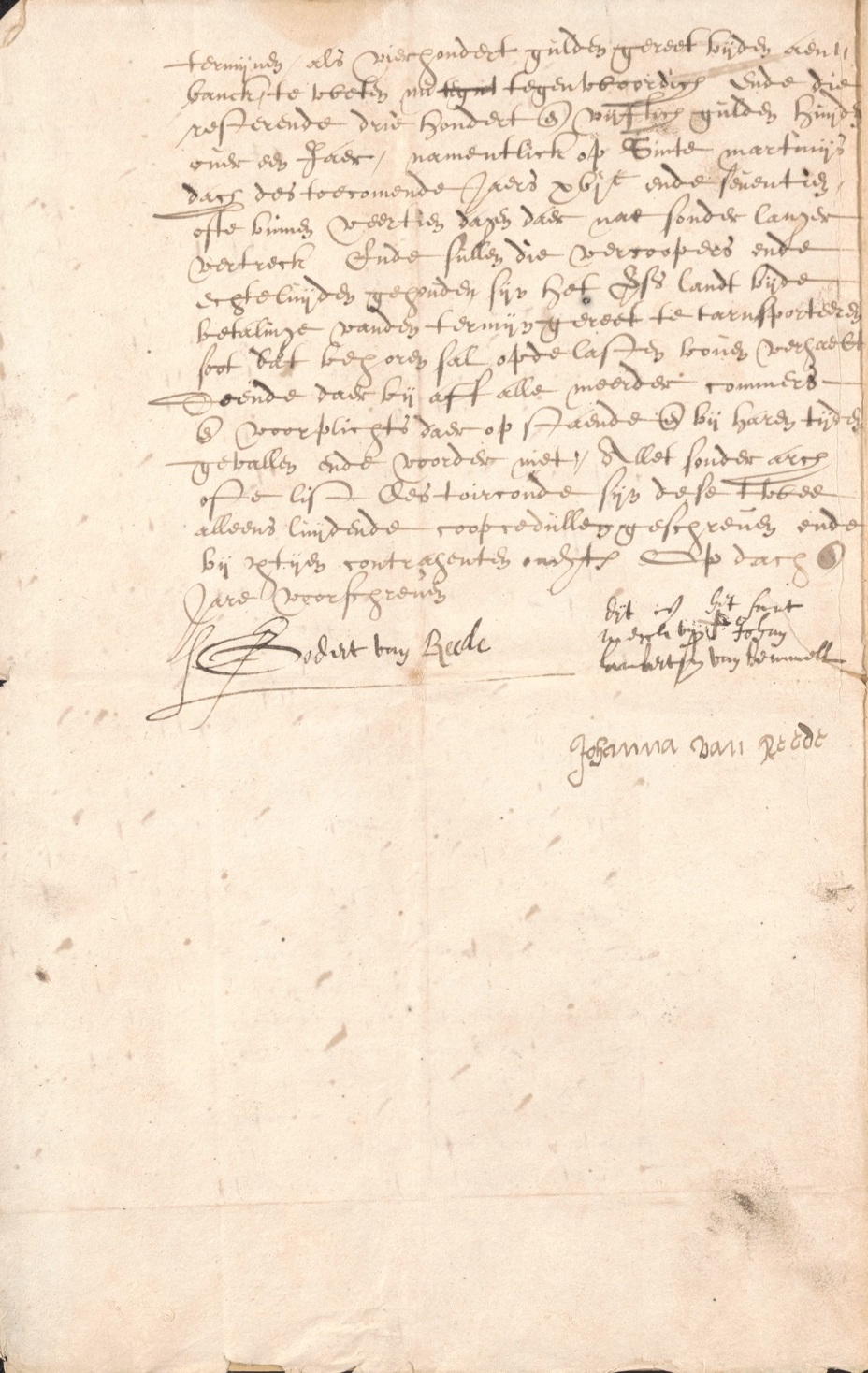 In het Utrechts Archief wordt een akte van overdracht bewaard van een stuk kleiland bij Amerongen (een vrije leenweer) door Jan (Lamberts) van Bemmel, de echtgenoot van Johanna van Reede, aan Godard van Reede. Het land was indertijd door de vader van de koper als bruidschat aan Johanna van Reede gegeven. Hieronder volgt een scan van de akte en daaronder de transcriptie.1