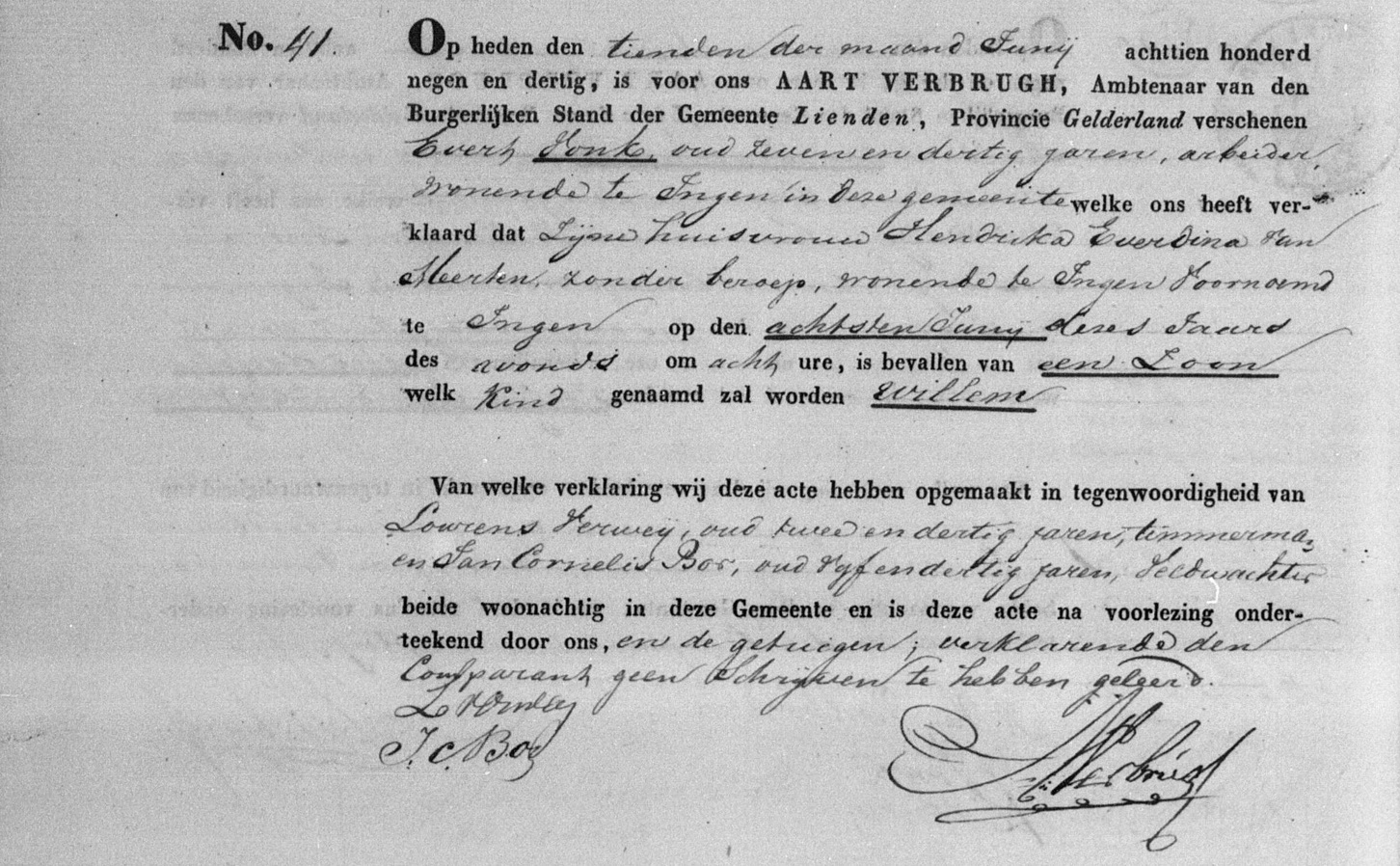 Hierboven wordt de geboorteakte van Willem Vonk (1839-1913) weergegeven.1 Op 10 juni 1839 verscheen Evert Vonk (1802-1864) voor de Ambtenaar van de Burgerlijke Stand van de Gemeente Lienden om aangifte te doen van de geboorte van zijn zoon. De ambtenaar in functie was burgemeester Aart Verbrugh (1772-1846). Evert was zeven en dertig jaar oud en arbeider van beroep. Hij verklaarde dat Willem op 8 juni 1839 om acht uur in de avond is geboren. Zijn moeder was Hendrika Everdina van Meerten (1812-1883), zonder beroep.2 Evert deed de aangifte samen met (1) Lourens Verweij (1807-1849), twee en dertig jaar oud en timmerman van beroep, en (2) Jan Cornelis Bor (1803-1848), vijf en dertig jaar oud en veldwachter van beroep. De aangever kon de akte niet ondertekenen omdat hij niet kon schrijven.
