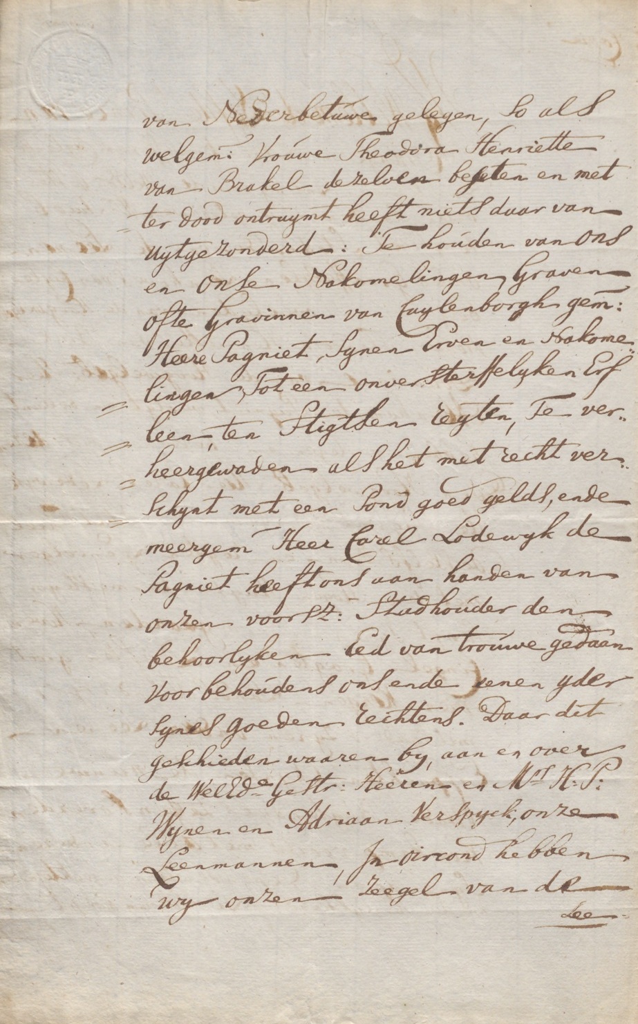 “Wij Willem de Vijfde Prince van Orange en Nassaú Graaff van Cuijlenborg, Doen te weeten: dat wij door den Weldn Gestr: onsen Raad en Lieve getroúwe Mr Jacob Jongbloet, Stadhoúder van de Leenen onses Graaffelijken Leenhoves van Cuijlenborgh, vermits overlijden van de Hoogwelgeb Vroúwe Theodora Henriëtte van Brakel, Doúariere van de Hoogwelgeb: Heer Abraham de Pagniet, verlijt en beleent hebben, verlegen en beleenen mits dezen den Hoogwelgeb: Heer Carel Lodewijk de Pagniet, Borgemr. der Stad Thiel desselfs zoon en regten Leenvolger, met den Hogen Huijse Carmesteijn Sampt Sijnen Boomgaarden Hoven Cingel, Gragten en Driften groot vier Mergen Lands Thiend vrij, mitsgaders zijnen onder Leenen, Erfpachten, Chijnsen, de nieúwe Wade Búijtendijks tegens over den Koekamp, voorts met alle anderen Sijne op en dependentien gerechtigheden in den Heerlijkheid Lienden ampte van Nederbetúwe gelegen, so als Welgem: Vroúwe Theodora Henriette van Brakel dezelven beseten en met ter dood ontruijmt heeft niets daar van uijtgezonderd: Te hoúden van ons en onse Nakomelingen, Graven ofte Gravinnen van Cuijlenborgh gem: Heere Pagniet, Sijnen Erven en Nakomelingen, Tot een onversterffelijken Erfleen, ten Stigtsen regten, Te verheergewaden als het met recht verschijnt met een Pond goed gelds, ende meergem Heer Carel Lodewijk de Pagniet heeft ons aan handen van onzen voorsz: Stadhoúder den behoorlijken Eed van troúwe gedaan Voorbehoúdens ons ende eenen ijder sijnes goeden rechtens. Daar dit geschieden waaren bij, aan en over de WelEde Gestr: Heeren en Ms H:P: Wijnen en Adriaan Verspijck; onze Leenmannen, In oircond hebben wij onzen zeegel van de Leenen hieronder aan doen hangen. Actúm Cuijlenborgh den 1e Aúgústij 1752.