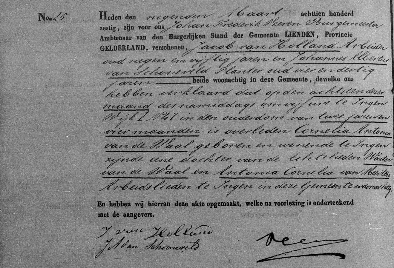 Hierboven wordt de overlijdensakte van Cornelia Antonia van de Waal (1857-1860) weergegeven.1 Op 9 maart 1860 verscheen Jacob van Holland (1800-1879) voor de Ambtenaar van de Burgerlijke Stand van de Gemeente Lienden om aangifte te doen van het overlijden van Cornelia Antonia. De ambtenaar in functie was Burgemeester Johan Frederik Veeren (1820-1874). Jacob was negen en vijftig jaar oud en arbeider van beroep. Hij deed de aangifte samen met Johannes Albertus van Schoneveld (1825-1901), vier en dertig jaar oud en planter van beroep. Zij verklaarden dat Cornelia Antonia op 8 maart 1860 om vijf uur in de middag is overleden in de leeftijd van twee jaar en vier maanden. Zij is geboren te Ingen en aldaar woonachtig in Wijk I nummer 47. Cornelia Antonia was een dochter van Wouter van de Waal (1824-1887) en Antonia Cornelia van Meerten (1816-1894).2