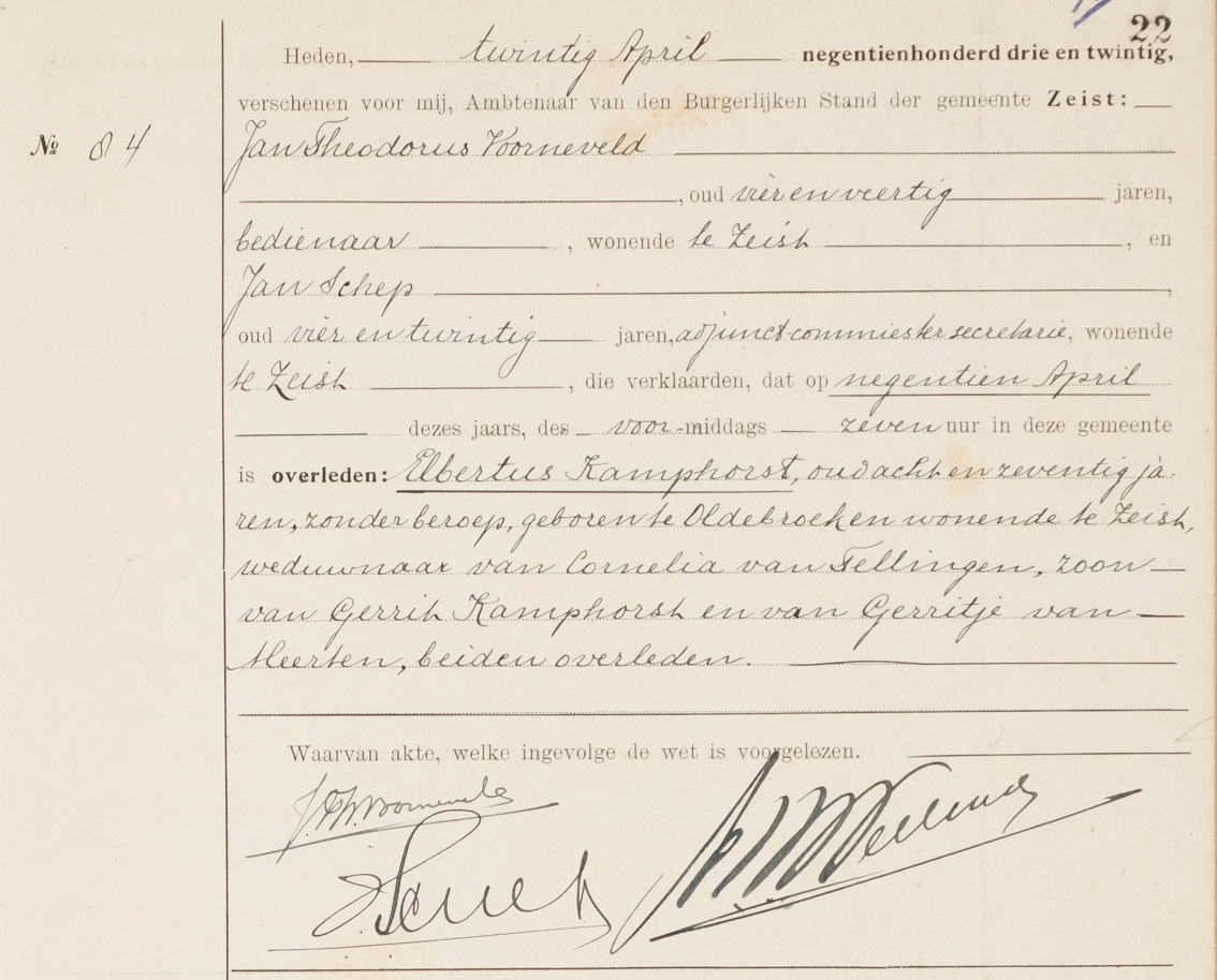 Hierboven wordt de overlijdensakte van Elbertus Kamphorst (1844-1923) weergegeven.1 Op 20 april 1923 verscheen Jan Theodorus Voorneveld (1878-1940) voor de Ambtenaar van de Burgerlijke Stand van de Gemeente Zeist om aangifte te doen van het overlijden van Elbertus. Jan Theodorus was vier en veertig jaar oud en bedienaar van beroep. Hij deed de aangifte samen met Jan Schep (1898-1945), vier en twintig jaar oud en adjunct-commies ter secretarie van beroep. Zij verklaarden dat Elbertus op 19 april 1923 om zeven uur in de ochtend is overleden in de leeftijd van acht en zeventig jaar. Hij was zonder beroep, geboren te Oldebroek en woonachtig te Zeist.2 Elbertus was weduwnaar van Cornelia van Tellingen (1845-1922) en een zoon van wijlen de echtelieden Gerrit Kamphorst (1809-1883) en Gerritje van Meerten (1801-1874).3