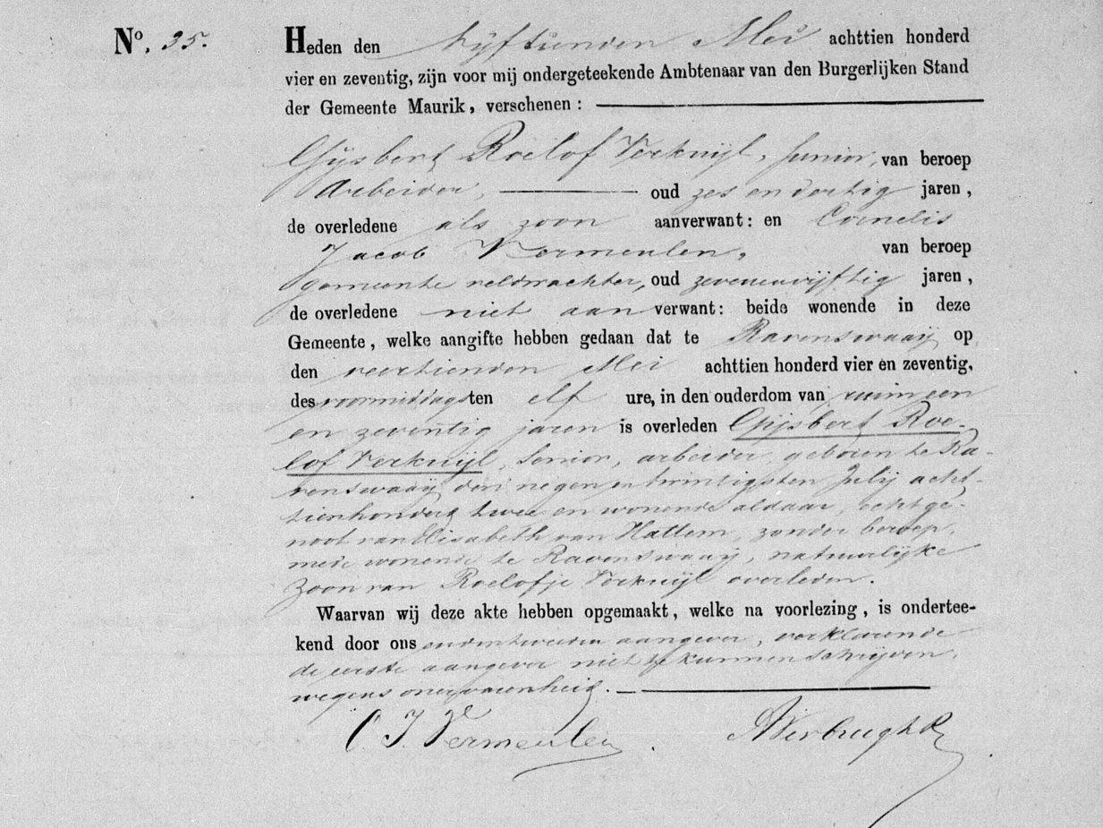 Hierboven wordt de overlijdensakte van Gijsbert Roelofse Verkuil (1802-1874) weergegeven.1 Op 15 mei 1874 verscheen Gijsbert Roelof Verkuil (1838-1875) voor de Ambtenaar van de Burgerlijke Stand van de Gemeente Maurik om aangifte te doen van het overlijden van zijn vader. Gijsbert Roelof was zes en dertig jaar oud en arbeider van beroep. Hij deed de aangifte samen met Cornelis Jacob Vermeulen (1817-1909), zeven en vijftig jaar oud en gemeenteveldwachter van beroep. Zij verklaarden dat Gijsbert Roelofse op 14 mei 1874 om elf uur in de ochtend is overleden in de leeftijd van ruim één en zeventig jaar. Hij was arbeider van beroep, geboren te Ravenswaaij op 29 juli 1802 en woonachtig aldaar.2 Gijsbert Roelofse was de echtgenote van Elisabeth van Hattem (1802-1879) en een buitenechtelijke zoon van wijlen Roelofje Verkuil (1773-1850). Zoon Gijsbert Roelof kon de akte niet ondertekenen omdat hij niet kon schrijven.