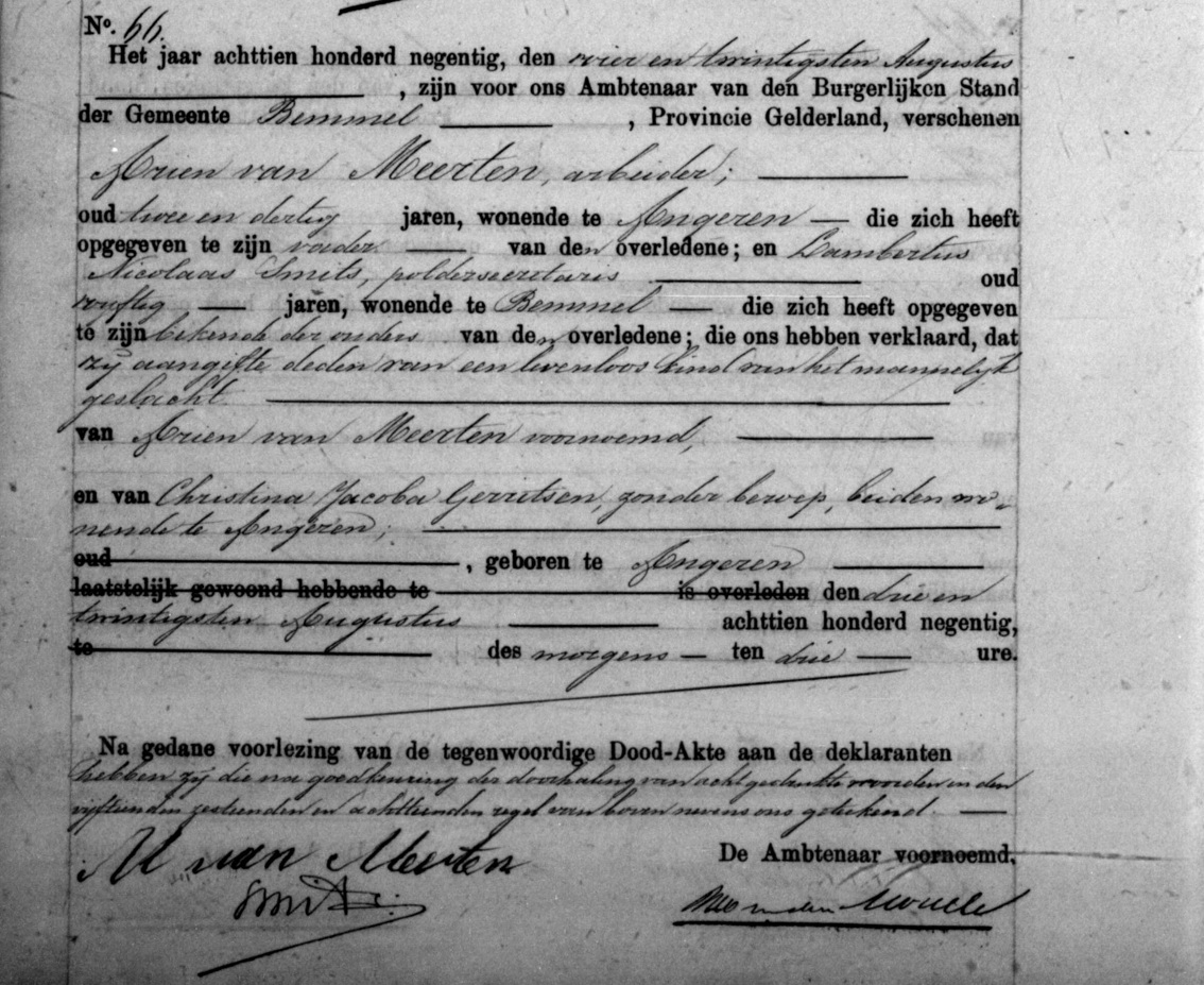 Hierboven wordt de overlijdensakte van een levenloos geboren kind van Arien van Meerten (1858-1933) en Christina Jacoba Gerritsen (1850-1897) weergegeven.1 Op 24 augustus 1890 verscheen Arien van Meerten (1858-1933) voor de Ambtenaar van de Burgerlijke Stand van de Gemeente Bemmel om aangifte te doen van het overlijden van zijn zoon. Arien was twee en dertig jaar oud, arbeider van beroep en woonachtig te Angeren. Hij deed de aangifte samen met Lambertus Nicolaas Smits (1839-?), vijftig jaar oud en poldersecretaris van beroep. Het levenloze kind was een jongen en kwam op 23 augustus 1890 om drie uur in de nacht ter wereld. Zijn moeder was Christina Jacoba Gerritsen (1850-1897), zonder beroep.2