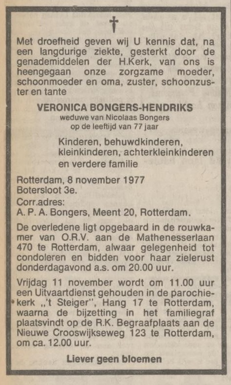 Hiernaast wordt de rouwadvertentie van Veronica Hendriks (1900-1977) weergeven.1 De rouwadvertentie werd geplaatst in het Algemeen Dagblad van 10 november 1977. ‘Met droefheid wordt de lezer kennis gegeven dat Veronica ‘na een langdurige ziekte, gesterkt door de genademiddelen der H.Kerk, van ons is heengegaan’. Ze was weduwe van Nicolaas Bongers (1888-1960) en woonde aan de Botersloot 3e te Rotterdam. Het correspondentieadres is van zoon Abraham Pieter Adrianus Bongers (1925-2009), die op Meent 20 te Rotterdam woonde. Veronica werd opgebaard in de rouwkamer van de Onderlinge Rouw Vereniging aan Mathenesserlaan 470 te Rotterdam. Op donderdagavond 10 november 1977 was er gelegenheid tot condoleren ‘en [te] bidden voor haar zielerust’. De begrafenisdienst werd gehouden op vrijdag 11 november 1977 om 11.00 uur in de parochiekerk ’t Steiger (Hang 17, Rotterdam). ‘Waarna de bijzetting in het familiegraf plaatsvindt op de R.K. Begraafplaats aan de Nieuwe Crooswijkseweg 123 te Rotterdam om ca. 12.00 uur’. De nabestaanden ontvangen ‘liever geen bloemen’.