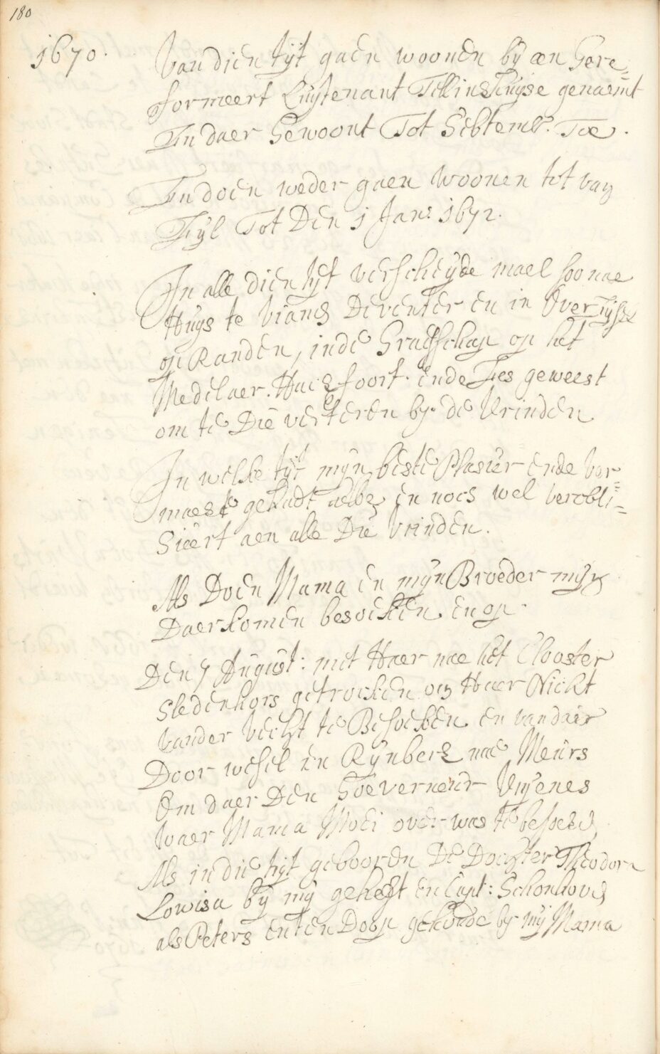 Als Doen Mama en mijn Broeder mijn Daerkomen besoeken En op den 7 Aúgúst: met Haer nae het Clooster Sledenhors getrocken om Haer Nicht vander Vecht te Besoeken en vandaer Door Wesel en Rijnberk nae Meurs om daer Den Goeverneúr Vrijenes waer Mama Moei over was te besoeken Als in die tijt gebooren de Dochter Theodora Louisa bij mij geheeft En Capt: Schonhoven als Peters En Ten Doop gehoude bij mij Mama.”